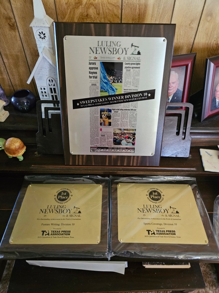 The Luling Newsboy & Signal, out of Luling, Texas, is where we won, with three first place placards in individual categories (for feature writing, feature photos and sports coverage), two seconds (for advertising and news writing), and a third (for special section). They awarded points based on those six awards (from 17 possible categories), which they then add up to determine the sweepstakes winner (overall, within divisions, which are split three ways to start (dailies, semiweeklies and weeklies), then divvied up once more within those three main divisions (based on the size of a newspaper’s circulation).