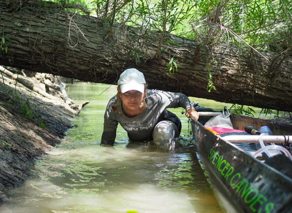 The boats started in San Marcos on April 29. There were over 50 log jams on the San Marcos River, many of them tall and massive. There was a mandatory portage “from the downstream vicinity of the Tivoli bridge into Hynes Bay” after a 3-mile log jam below the bridge. A white flag was hung below the log jam on a tree limb marking a 2.2-mile portage into Hynes Bay, increasing the portage to 5.2 miles total.